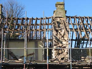 A new owner found that the front wall was leaning outwards and all renovation was stopped and structural scaffolding put in place to support it. After very prolonged discussions with the various authorities as it is a listed building, permission was given to re-build the front wall. The front wall was carefully dismantled and rebuilt so the house’s appearance was unchanged.